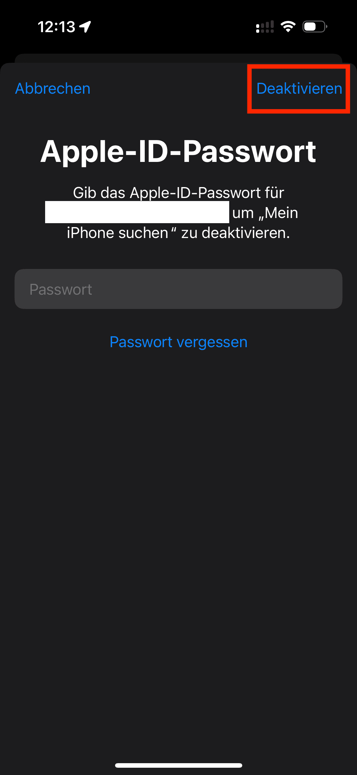 11: Geben Sie ihr Apple ID Passwort ein und wählen Sie deaktivieren.