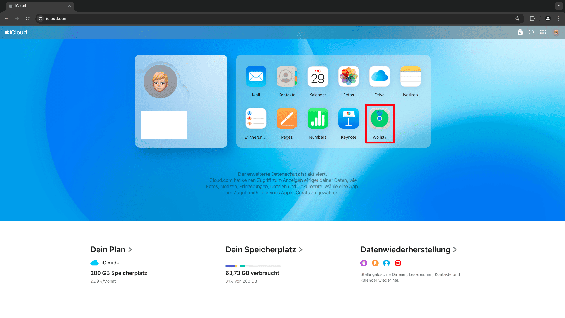 1: Loggen Sie sich auf www.icloud.com mit Ihrer Apple ID ein und wählen Sie die Option Wo ist?